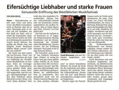“Für Leonora entwirft Verdi Melodien von weichem Zauber mit leicht kolorierten oder versprengten Spit-zen, das hebt sie aus den belasteten Beziehungen der anderen heraus, Cristiana Oliveira legt sich mit duftiger Stimme in den Dreiertakt der erinnerten Begegnung mit dem Trou-badour. Sie hat einen schon subs tanzvollen, auch in der Tiefe leuch-tenden, nach oben bezaubernd klaren Sopran und gestaltet gerade die umfangreichen Szenen gegen Ende mit großer Intensität. Wunderbar.”
